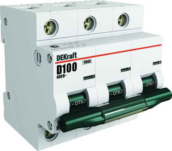 Автоматический выключатель серии ВА-201 DEKraft; 3P; номинальный ток 100 А; характеристика D; отключающая способность 10 кА; ширина – 4,5 мод. х 18мм. Монолитная лицевая панель обеспечивает безопасную эксплуатацию аппарата. Окошко-индикатор всегда показывает состояние аппарата вне зависимости от положения рукоятки управления. Двухпозиционная защелка облегчает монтаж выключателя. Клеммы рассчитаны на подключение проводников сечением до 35 кв.мм.
