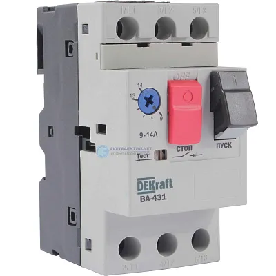Автоматический выключатель серии ВА-431 DEKraft; диапазон уставок тока 9,0 - 14,0 А; ном. раб. напряжение 690 В; сечение подключаемых проводников 1,0 - 6,0 кв. мм. Корпус устройства изготовлен из самозатухающей пластмассы. Автоматические выключатели защиты двигателя серии ВА-431 DEKraft предназначены для управления и защиты трехфазных асинхронных электродвигателей от короткого замыкания, перегрузки и выпадения фазы. Дополнительно доступен ряд аксессуаров, облегчающих работу с устройством.