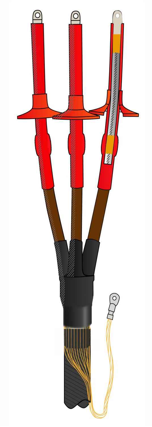 Муфта термоусаживаемая концевая наружной установки для трехжильного кабеля с пластмассовой изоляцией из сшитого полиэтилена с ПРОВОЛОЧНЫМ экраном, БЕЗ БРОНИ, на напряжение до 10 кВ включительно 3ПКНТпН-10-35...50-КПЭ (с наконечниками)
