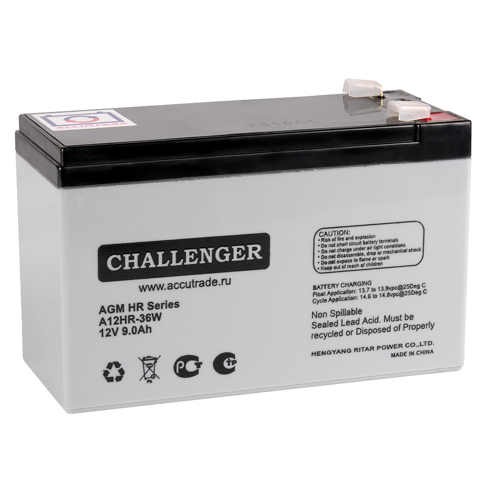CHALLENGER A12HR‑36W герметичный необслуживаемый AGM‑аккумулятор, 12 В · 9 А·ч · 36 Вт за 15 мин · срок службы до 8 лет.
