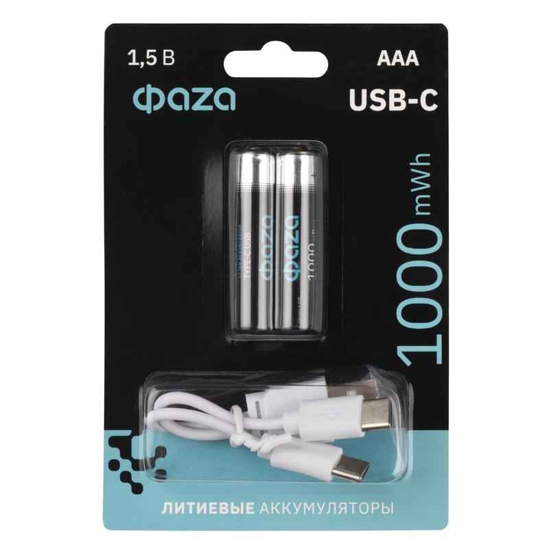 Аккумулятор литиевый AAA 1.5В Li-Ion 1000мВт.ч 660мА.ч зарядка от Type-C шнур в комплекте BL-2 (уп.2шт) ФАZА 5061637