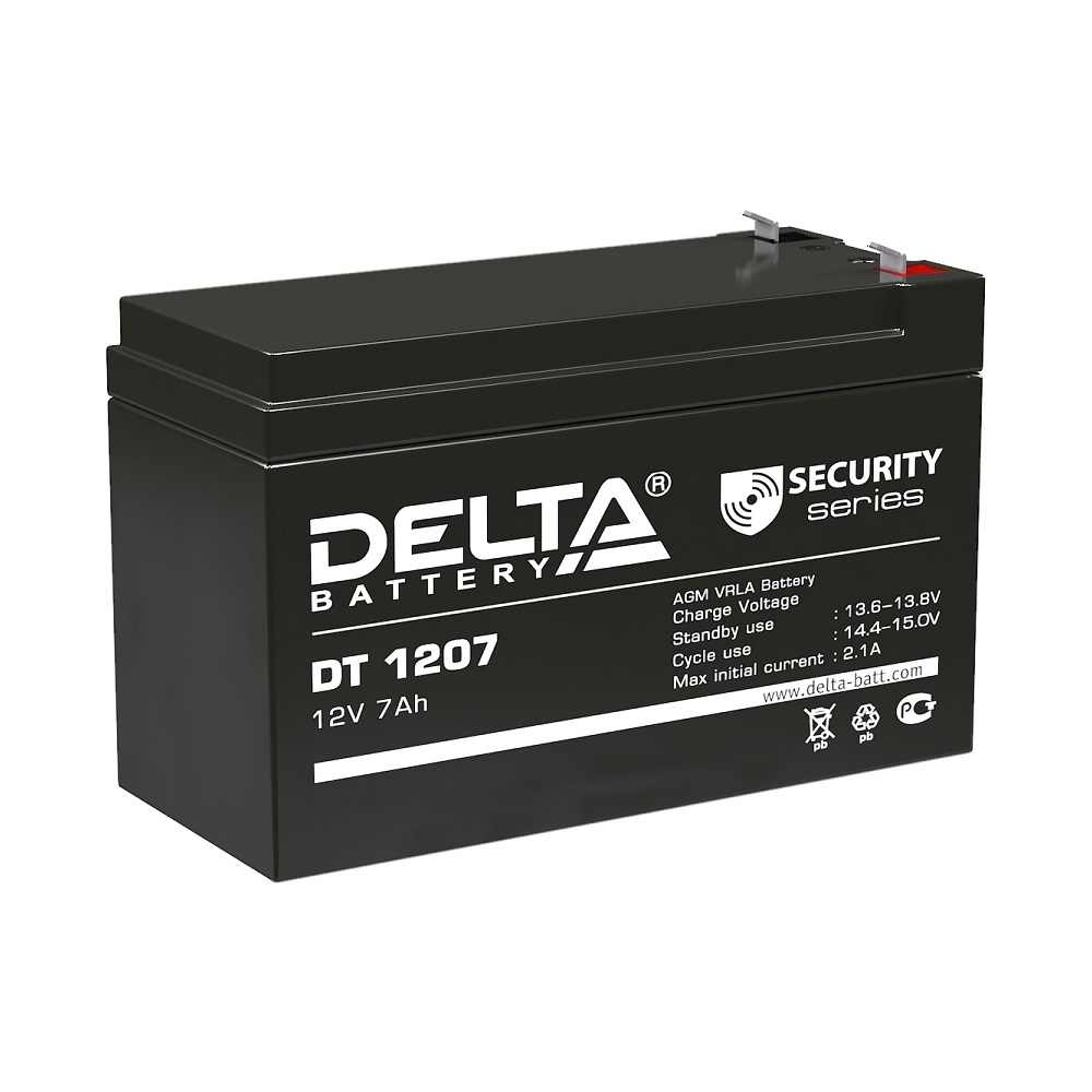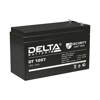 Аккумуляторная батарея Delta DT 1207 — герметичный свинцово-кислотный аккумулятор напряжением 12 В и номинальной ёмкостью 7 А·ч (при 20-часовом разряде). Она изготовлена по технологии AGM, в которой электролит абсорбирован в микропористом сепараторе, что исключает утечку жидкости и делает батарею необслуживаемой. Корпус выполнен из негорючего ABS-пластика, устойчивого к воздействию внешних факторов. Модель предназначена для работы как в буферном режиме (постоянная подзарядка), так и в циклическом режиме при умеренной глубине разряда.