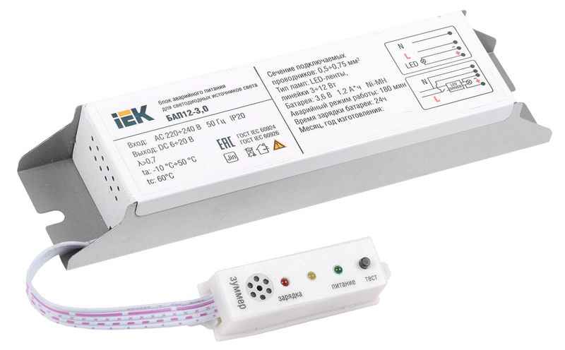 БАП12-3 IEK встраивается в светильник или в выносной бокс и обеспечивает работу в аварийном режиме светодиодных ламп, светодиодных модулей (СИД) и светодиодных лент напряжением питания 6-20 В и максимальной мощностью от 3 Вт до 12 Вт.