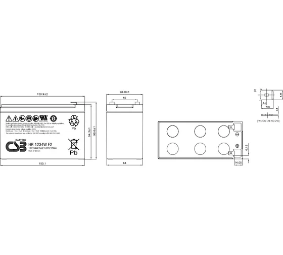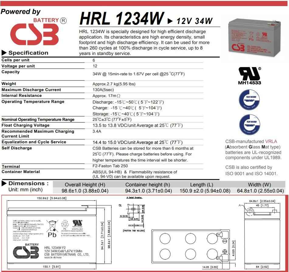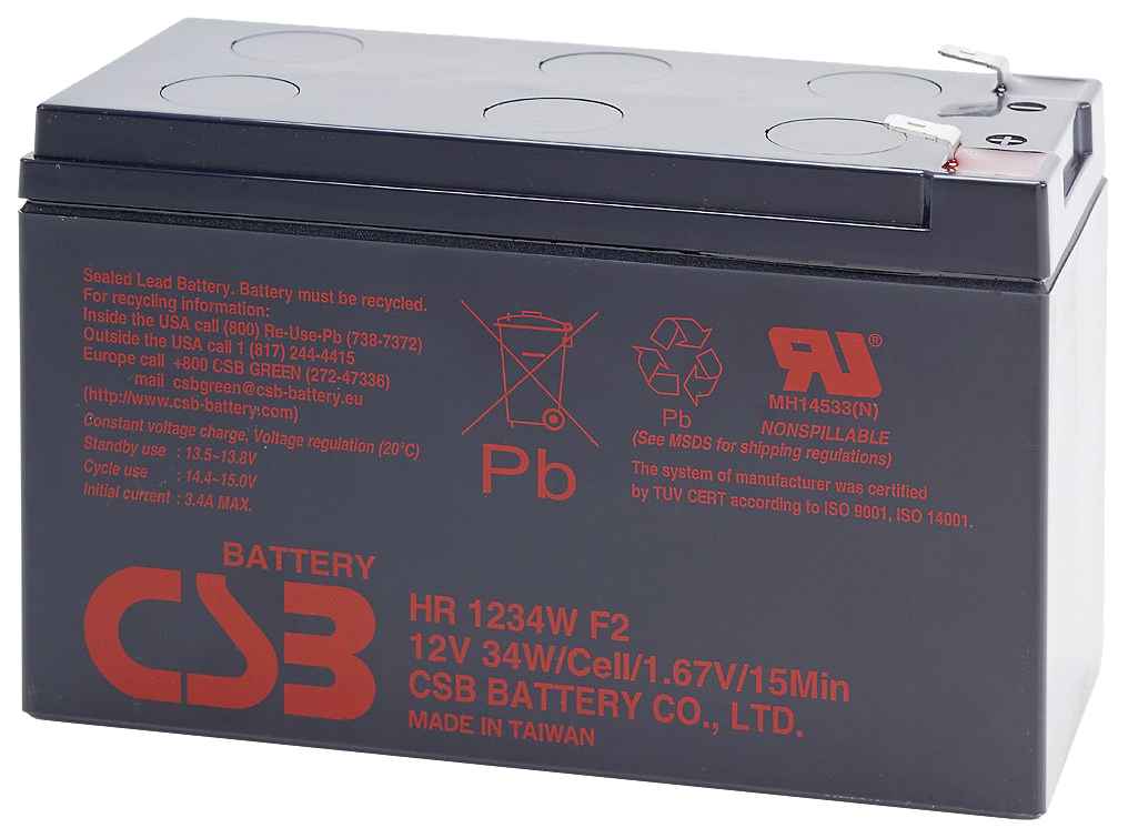 Батарея CSB HR 1234W F2 специально спроектирована для работы в режиме высоких токов разряда с короткой продолжительностью. Ее ключевые особенности — малый объем, легкий вес и высокая эффективность разряда. Благодаря технологии AGM электролит полностью абсорбирован в стекловолоконном сепараторе, что делает батарею герметичной, необслуживаемой и безопасной для эксплуатации в любом положении (кроме перевернутого).
