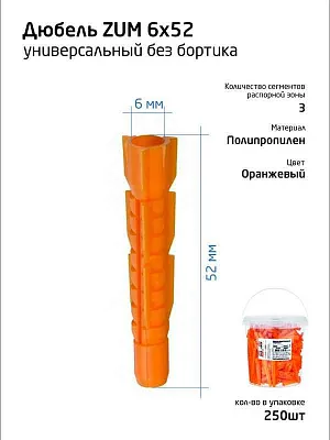 Дюбель универсальный ZUM может быть двух видов: с плоским цилиндрическим бортиком и 3-х сегментной распорной зоной; без бортика и с 3-х сегментной распорной зоной. Применяется для крепления различных деталей и изделий к следующим основаниям: бетон, полнотелый и пустотелый кирпич, газобетон, керамзитобетон, листовые материалы, камень. Изготовлен из полипропилена. В полнотелых материалах дюбель работает за счет распора, а в пустотелых и листовых материалах скручивается в плотный узел и фиксируется в виде «якоря» с внутренней стороны. Дюбель используется совместно с универсальными шурупами, сантехническими болтами, шпилькой-шурупом и т.д. Не рекомендуется применять его с черными саморезами. Устанавливается в предварительно просверленное отверстие.