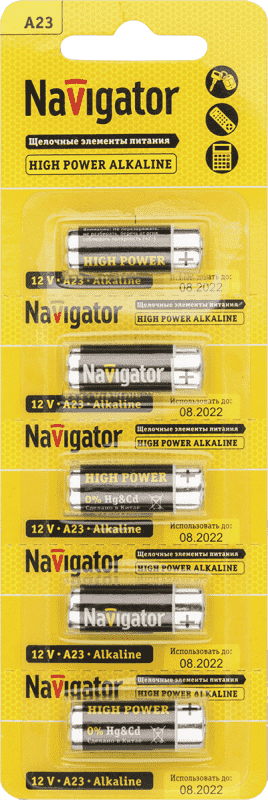 Элемент питания алкалиновый A23 61 464 NBT-NE-A23-BP5 для пультов сигнализаций (блист.5шт) NAVIGATOR 61464