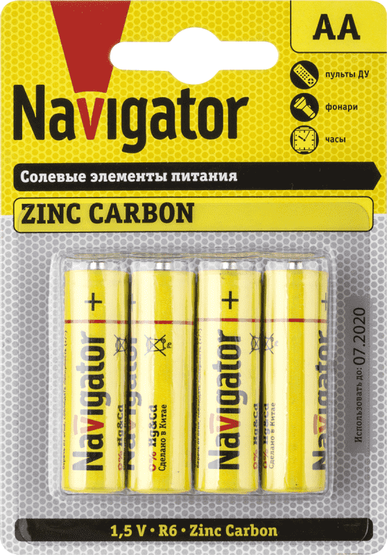 Элемент питания 94 758 NBT-NS-R6-BP4 (блист.4шт) Navigator 17009 представляет собой цилиндрическую цинково-угольную батарейку типоразмера АА.