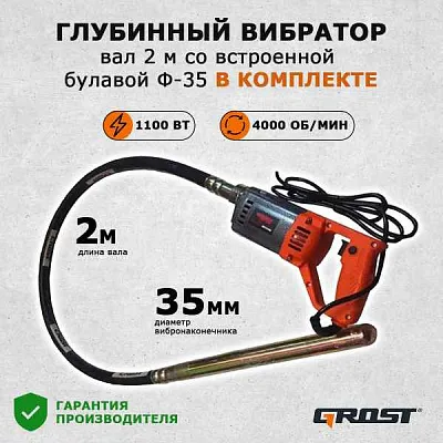 Глубинный вибратор Grost VGP 1150С/2/35 предназначен для уплотнения бетонных смесей в монолитных конструкциях. Оснащён гибким валом длиной 2 метра, булавой диаметром 35 мм маятникового типа и электродвигателем 1150 Вт. Подходит для профессионального использования в строительстве.