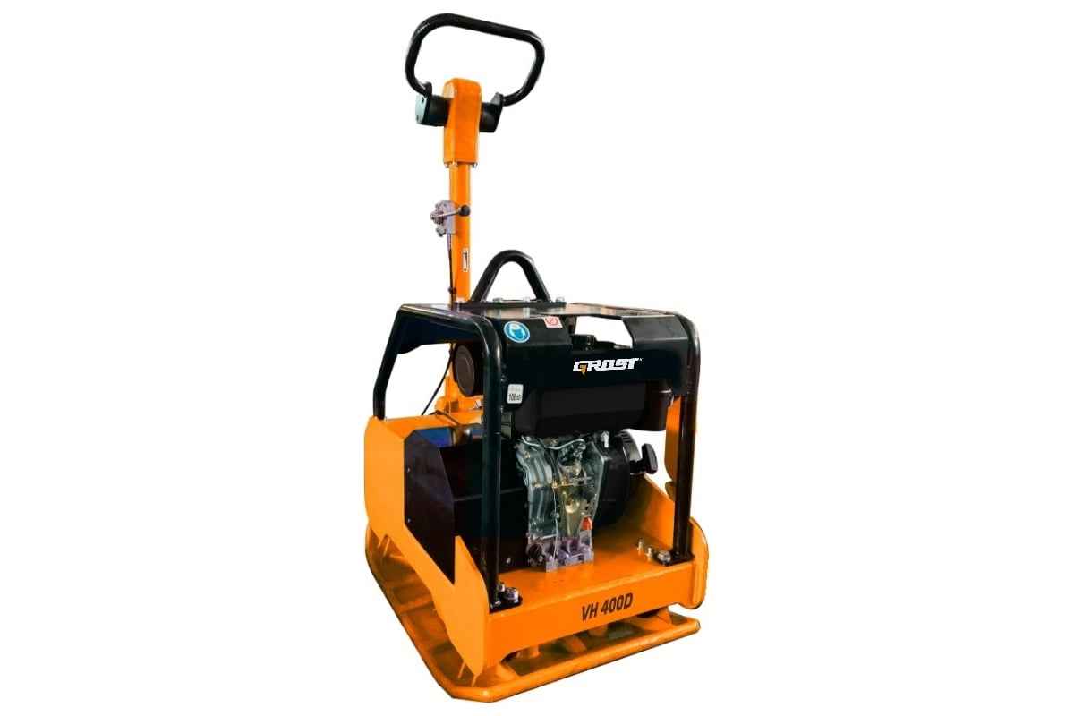 Реверсивная виброплита GROST VH 400D с двигателем Honda GX270. Вес 400 кг, центробежная сила 40 кН, скорость вибрации 5800 об/мин. Оснащена системой орошения, транспортировочными колесами и защитой от вибрации оператора.