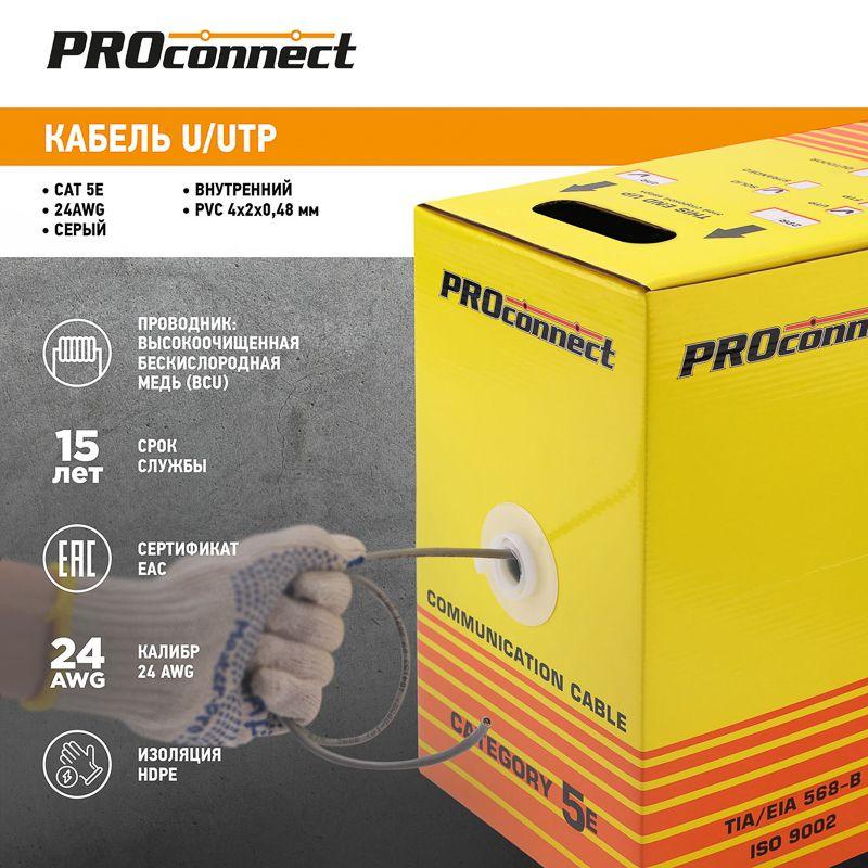 Кабель UTP 4PR 24AWG, CAT5e (бухта 305 м) PROconnect. Неэкранированная витая пара, материал проводника высокоочищенная бескислородная медь, калибр (24 AWG). Материал оболочки — ПВХ (PVC).