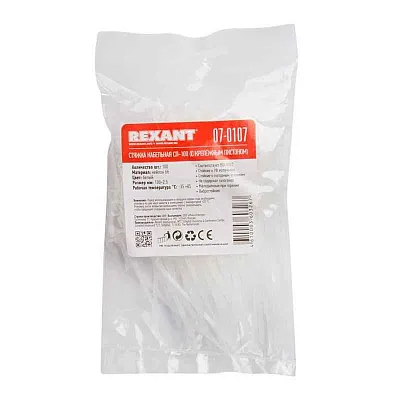 Хомут нейлоновый с кабельным пистоном (кабельная стяжка) 100х2,5 мм белый REXANT предназначен для крепления или обвязки в жгут кабелей и проводов, крепления гибких гофротруб, а также других предметов к несущей поверхности или для соединения между собой. Такая стяжка используется при проведении электромонтажных работ, при монтаже структурированных кабельных систем, для бытовых нужд, а также в других отраслях народного хозяйства.