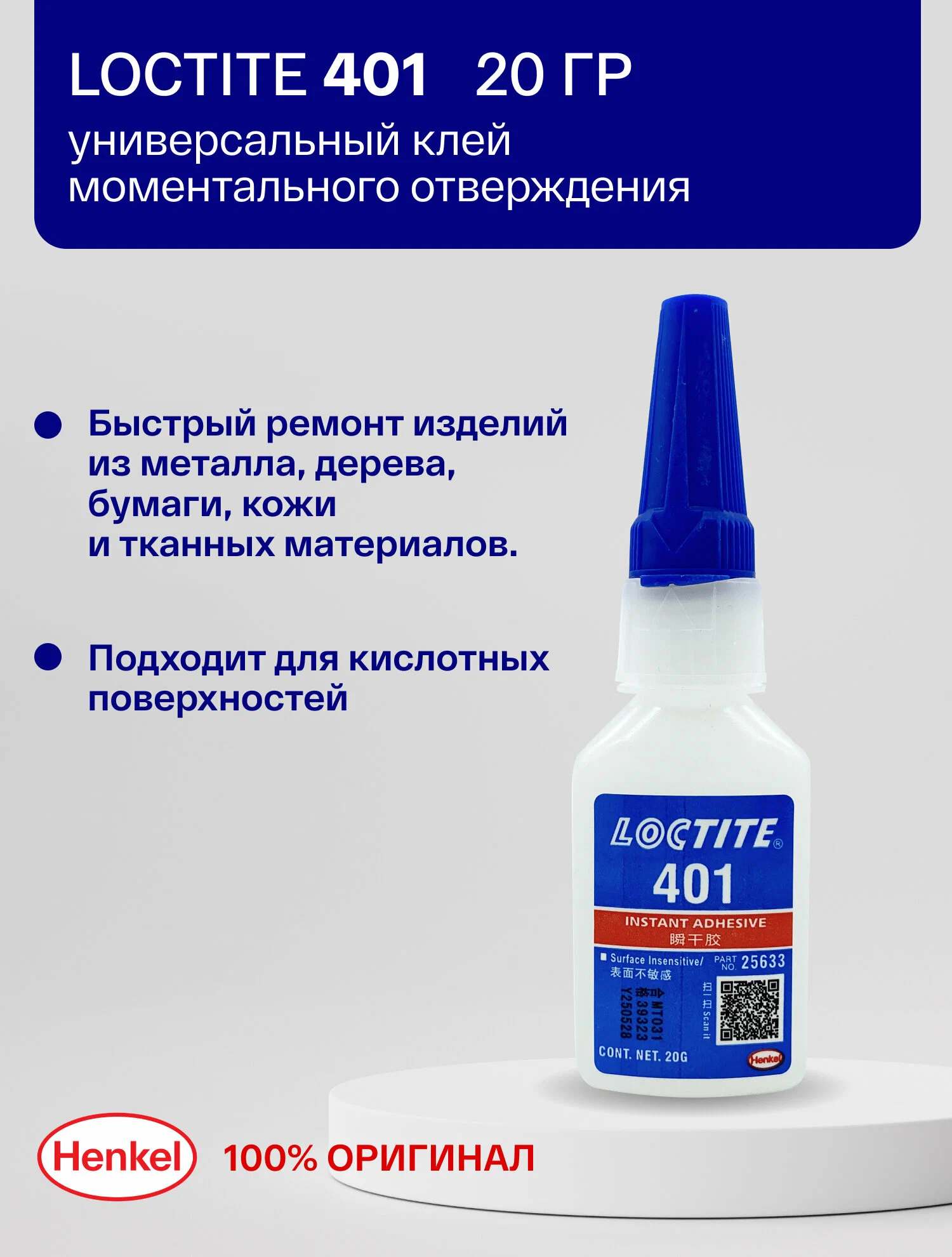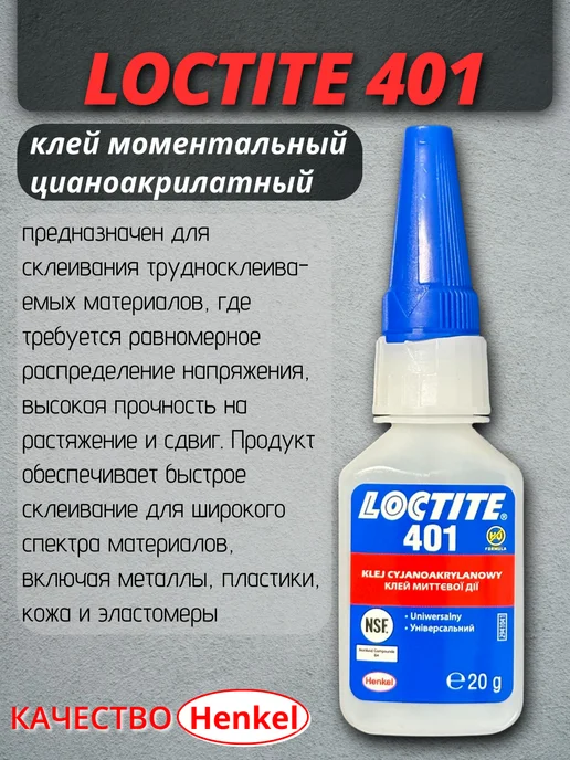 LOCTITE 401 - универсальный однокомпонентный моментальный цианоакрилатный клей общего назначения с низкой вязкостью. Предназначен для быстрого и надёжного склеивания широкого спектра материалов, включая трудносцепляемые и пористые поверхности.