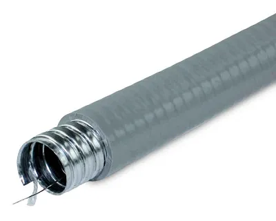 Металлорукав в ПВХ изоляции предназначен для защиты проводов и кабелей от механических повреждений и воздействия внешней среды. Толстостенный, серый, с протяжкой, длина 20 метров.