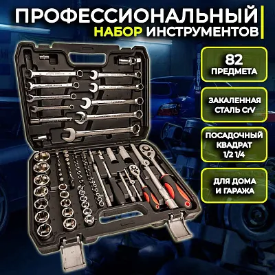 82 предмета для ремонта и строительства: отвертки, гаечные ключи, биты, шестигранники. Хромованадиевая сталь, ударопрочный кейс
