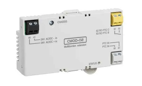 CMOD-02 — плата расширения для частотных преобразователей ACS580, обеспечивающая подключение внешнего питания 24 В (AC/DC) и поддержку температурного датчика PTC.