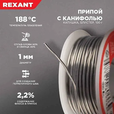 Припой с канифолью REXANT представляет собой проволоку (диаметром 1 мм) из сплава олова (60 %) и свинца (40 %). Используется в пайке для соединения деталей между собой и позволяет создать герметичный, механически прочный (устойчивый) шов. Нагреваясь до температуры плавления (183...188 °C) припой: расплавляется, смачивает спаиваемый металл и, растекаясь по нему — заполняет место между соединяемыми деталями.