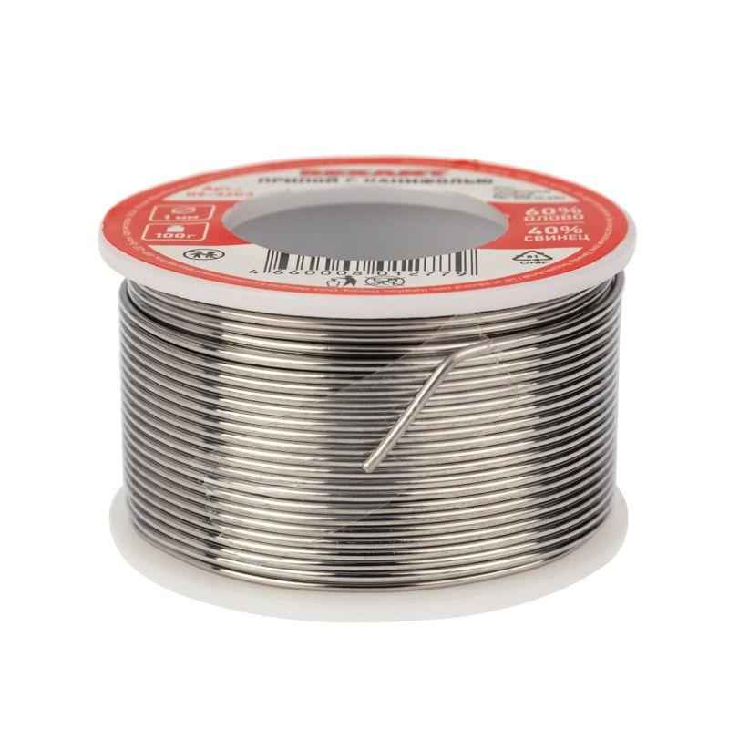 Припой с канифолью REXANT представляет собой проволоку (диаметром 1 мм) из сплава олова (60 %) и свинца (40 %). Используется в пайке для соединения деталей между собой и позволяет создать герметичный, механически прочный (устойчивый) шов. Нагреваясь до температуры плавления (183...188 °C) припой: расплавляется, смачивает спаиваемый металл и, растекаясь по нему — заполняет место между соединяемыми деталями.