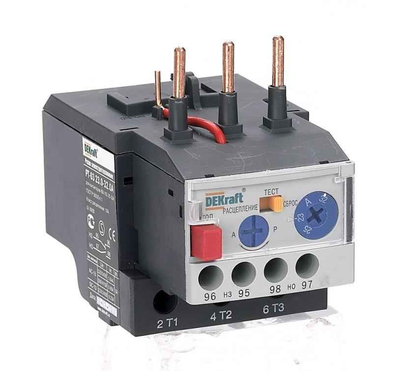 Тепловое реле перегрузки серии РТ-03 DEKraft; предназначено для применения с контакторами КМ-103 на ток 25-32 А; трехполюсное; диапазон уставок реле 23-32 А; класс расцепления – 10А; два режима повторного включения - ручной и автоматический. Тепловые реле РТ-03 применяются для защиты цепей переменного тока и электродвигателей от перегрузки, асимметрии фаз, затянутого пуска и заклинивания ротора. Реле подходит к соответствующим контакторам других производителей.