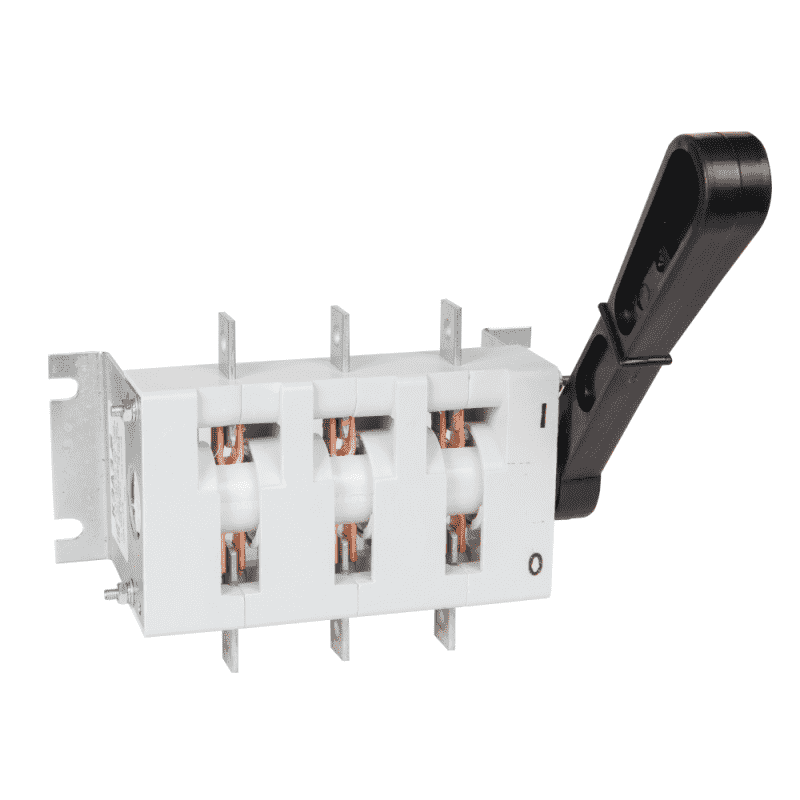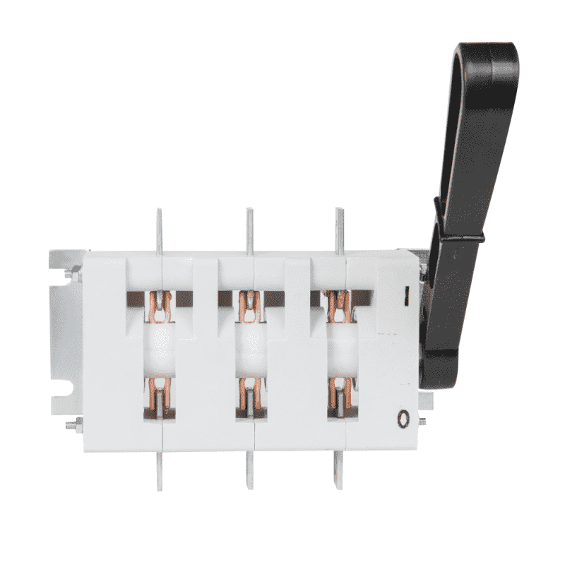 Выключатель-разъединитель 3 полюсный на номинальный ток 100 А, в котором установлена несъемная рукоятка.