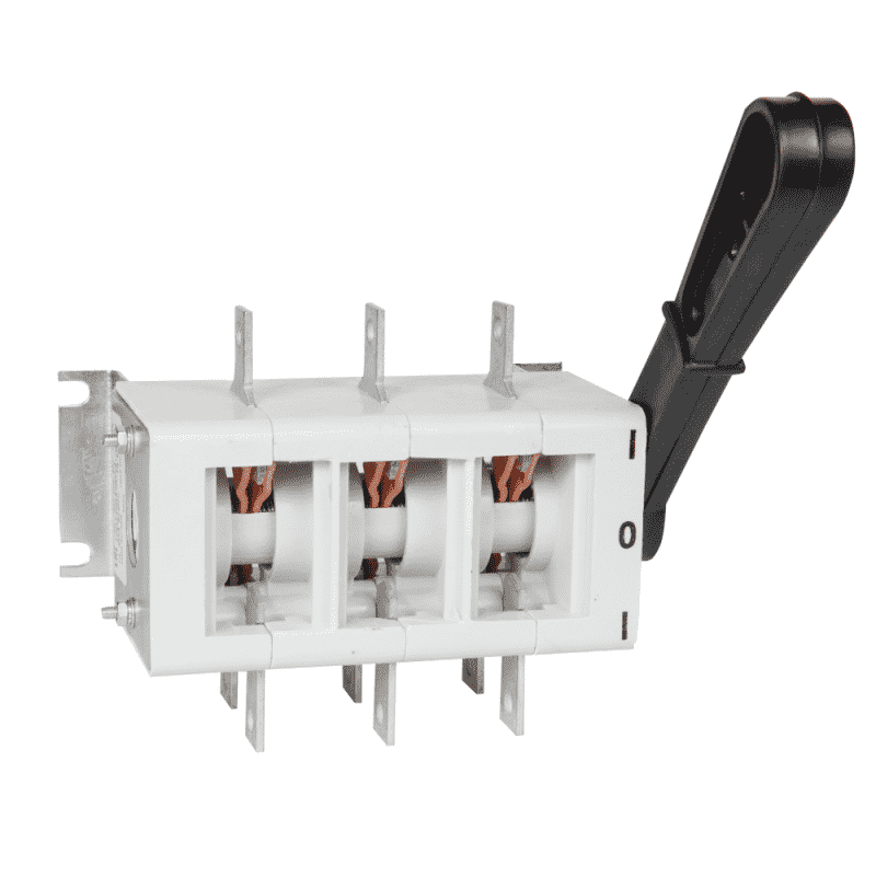 Выключатель-разъединитель 3 полюсный на номинальный ток 100 А, в котором установлена несъемная рукоятка.