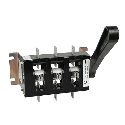 Выключатель-разъединитель 3 полюсный на номинальный ток 100 А, в котором установлена несъемная рукоятка.