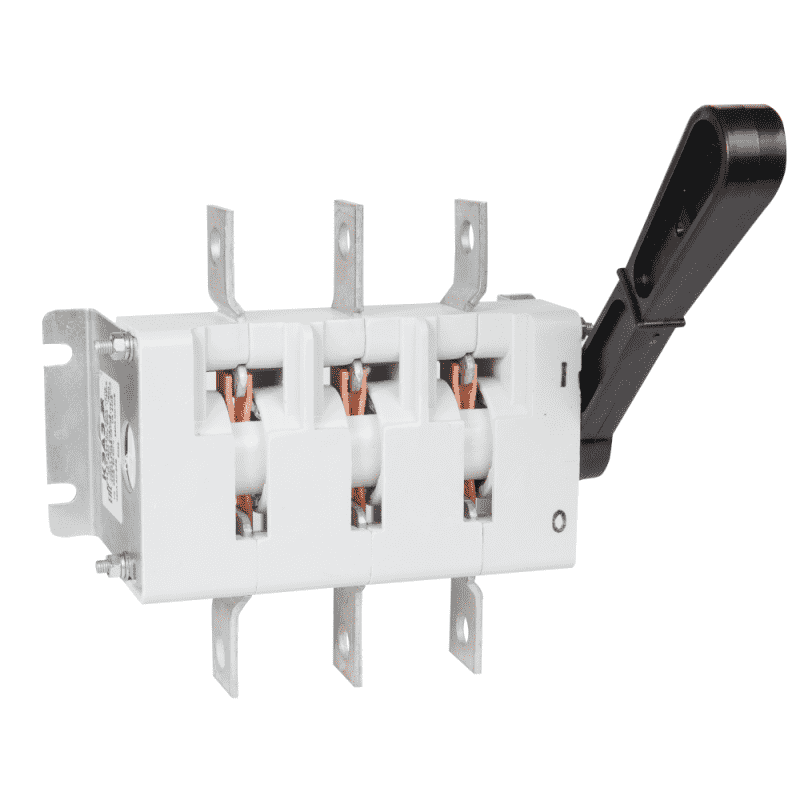 Выключатель-разъединитель 3 полюсный на номинальный ток 250 А, в котором установлена несъемная рукоятка.