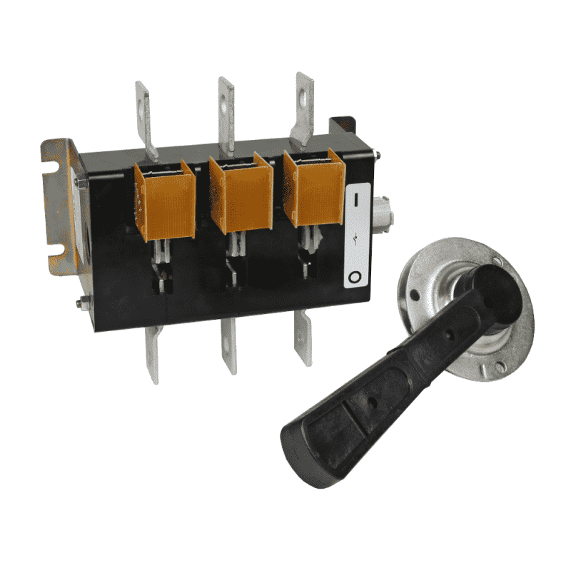 Выключатель-разъединитель 3 полюсный на номинальный ток 250 А, в котором установлена съемная рукоятка.