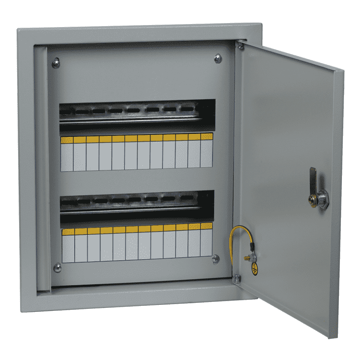 Встраиваемый, с дверцей и замком. Изготовлен из металлического сплава, серого цвета. Размеры: 390 х 120 х 340 мм. Защищен от проникновения пыли и вертикальных капель (IP31).