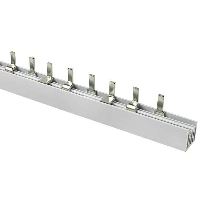 Шины соединительные производятся в двух исполнениях: FORK («вилка») и PIN («гребенка») на номинальные токи 63 и 100 А, на одно-, двух-,трех- и четырехфазную нагрузку. Шины соединительные представляют собой пластины, выполненные из меди (шины на 100 А – из луженой меди), закрепленные в корпусе из диэлектрического материала, не поддерживающего горение, и выпускаются стандартной длиной 1 метр.
