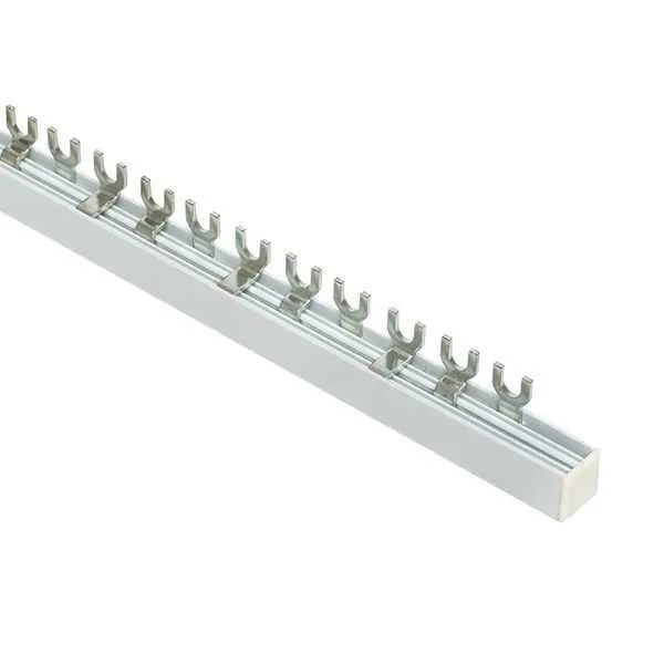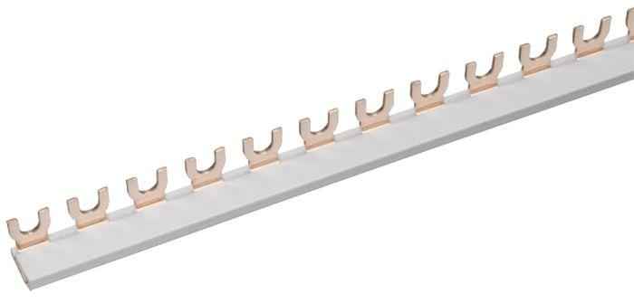 Шины соединительные производятся в двух исполнениях: FORK («вилка») и PIN («гребенка») на номинальные токи 63 и 100 А, на одно-, двух-,трех- и четырехфазную нагрузку. Шины соединительные представляют собой пластины, выполненные из меди (шины на 100 А – из луженой меди), закрепленные в корпусе из диэлектрического материала, не поддерживающего горение, и выпускаются стандартной длиной 1 метр.