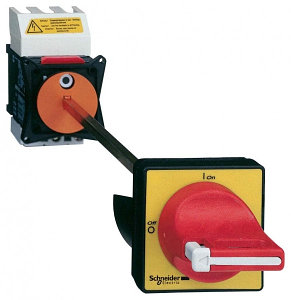 - Рукоятка: поворотная, красная с жёлтой панелью (для аварийного отключения)