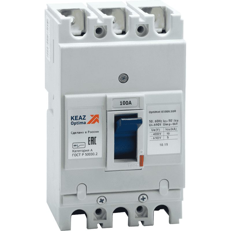 Блочный автоматический 3 полюсный выключатель переменного тока с предельной коммутационной способностью при переменном токе 10 кА на номинальный ток 100 А.