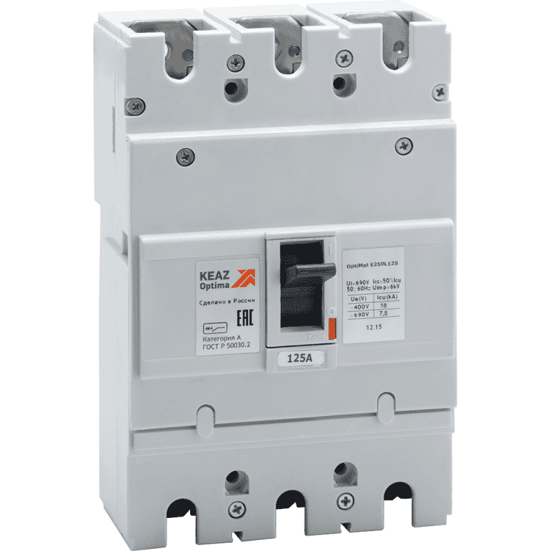Блочный автоматический 3 полюсный выключатель переменного тока с предельной коммутационной способностью при переменном токе 18 кА на номинальный ток 125 А.