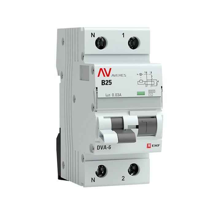 Выключатель автоматический дифференциального тока 2п (1P+N) B 25А 30мА тип AC 6кА DVA-6 Averes EKF rcbo6-1pn-25B-30-ac-av