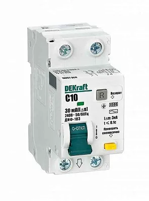 Автоматическими выключателями дифференциального тока серии ДИФ-103 DEKraft; 1N+P; номинальный ток 10 А; ном.дифф. ток 30 мА; тип дифференциального расцепителя - AC; кривая отключения - С; на DIN-рейку.
