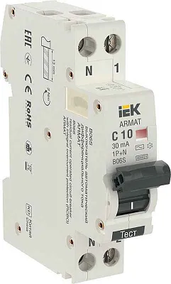Автоматические выключатели дифференциального тока (АВДТ) ARMAT серии B06S могут осуществляют функции защиты от токов перегрузки и короткого замыкания и защиты человека от токов замыкания на землю. Модельный ряд включает в себя устройства с номинальными токами от 6 до 32 А, характеристиками срабатывания по сверхтоку B и C, типами защит AC и A с номинальным дифференциальным током отключения 30 мА. Номинальная отключающая способность АВДТ ARMAT серии B06S составляет 6 кА.