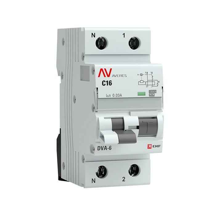 Выключатель автоматический дифференциального тока 2п (1P+N) C 16А 30мА тип A 6кА DVA-6 Averes EKF rcbo6-1pn-16C-30-a-av