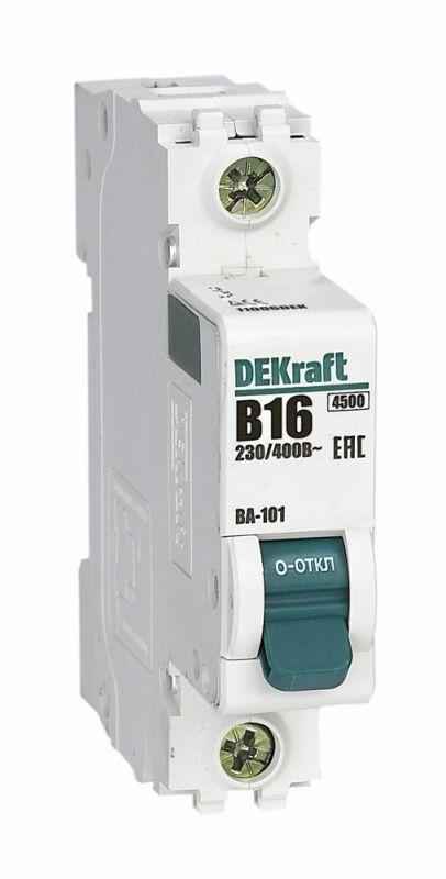 Автоматический выключатель серии ВА-101 DEKraft; 1P; номинальный ток 16 А; характеристика B; отключающая способность 4,5 кА. Новый механизм расцепления мгновенно разрывает цепь при возникновении аварии. 5 монолитных заклепок повышают прочность корпуса аппарата. Сплошная лицевая панель обеспечивает безопасность эксплуатации аппарата. Боковые каналы охлаждения повышают стабильность работы при высоких температурах окружающей среды. Полностью автоматизированный контроль качества производства.
