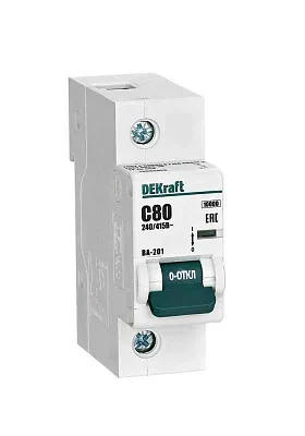 Автоматический выключатель серии ВА-201 DEKraft; 1P; номинальный ток 80 А; характеристика С; отключающая способность 10 кА; ширина – 1,5 мод. х 18мм. Монолитная лицевая панель обеспечивает безопасную эксплуатацию аппарата. Окошко-индикатор всегда показывает состояние аппарата вне зависимости от положения рукоятки управления. Двухпозиционная защелка облегчает монтаж выключателя. Клеммы рассчитаны на подключение проводников сечением до 35 кв.мм.