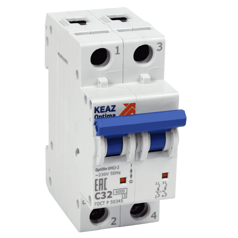 Модульный автоматический 2 полюсный выключатель переменного тока с предельной коммутационной способностью при переменном токе 6 кА на номинальный ток 32 А .