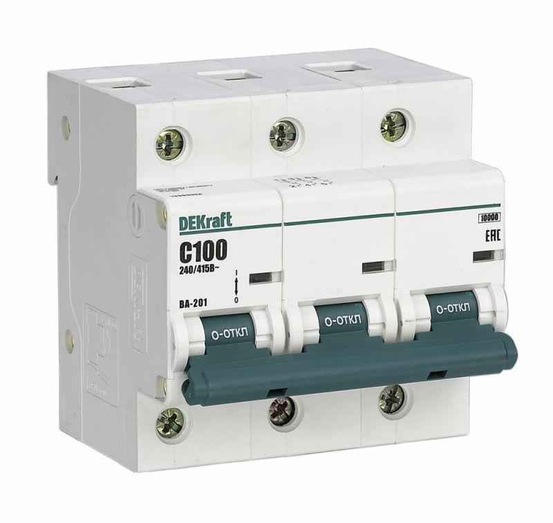 Автоматический выключатель серии ВА-201 DEKraft; 3P; номинальный ток 125 А; характеристика C; отключающая способность 10 кА; ширина – 4,5 мод. х 18мм. Монолитная лицевая панель обеспечивает безопасную эксплуатацию аппарата. Окошко-индикатор всегда показывает состояние аппарата вне зависимости от положения рукоятки управления. Двухпозиционная защелка облегчает монтаж выключателя. Клеммы рассчитаны на подключение проводников сечением до 35 кв.мм.
