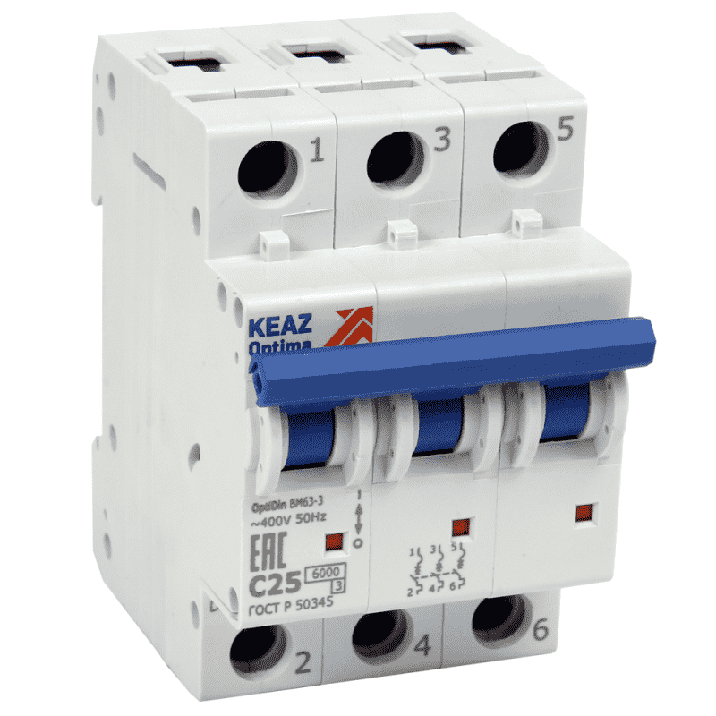 Модульный автоматический 3 полюсный выключатель переменного тока с предельной коммутационной способностью при переменном токе 6 кА на номинальный ток 32 А .