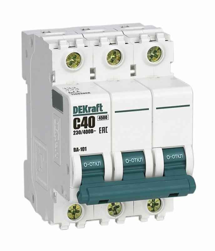 Автоматический выключатель серии ВА-101 DEKraft; 3P; номинальный ток 40 А; характеристика С; отключающая способность 4,5 кА. Новый механизм расцепления мгновенно разрывает цепь при возникновении аварии. 5 монолитных заклепок повышают прочность корпуса аппарата. Сплошная лицевая панель обеспечивает безопасность эксплуатации аппарата. Боковые каналы охлаждения повышают стабильность работы при высоких температурах окружающей среды. Полностью автоматизированный контроль качества производства.