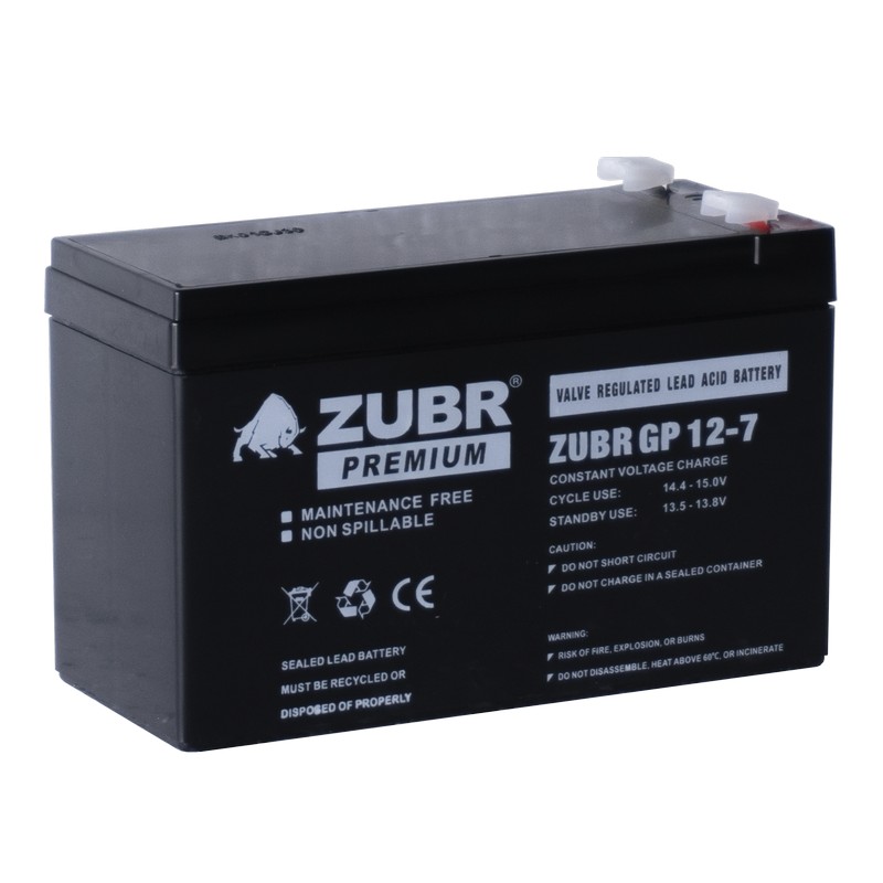 Надёжный герметичный аккумулятор ZUBR GP 12‑7 Ah на основе AGM‑технологии: напряжение 12 В и ёмкость 7 А·ч, компактные размеры 151×65×94–100 мм и вес около 2,2 кг. Применяется для ИБП, охранных систем и видеонаблюдения с гарантией и сроком службы до 5 лет.